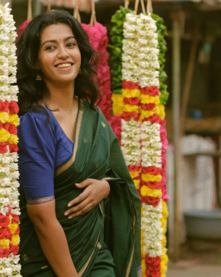 Green Color Premium Cotton Silk Saree With Classy Navy Blue Blouse and tassels