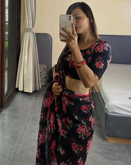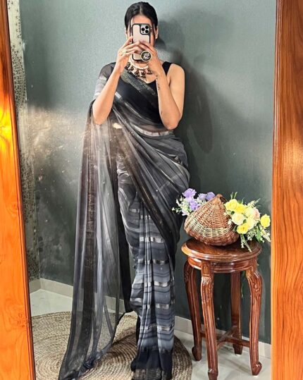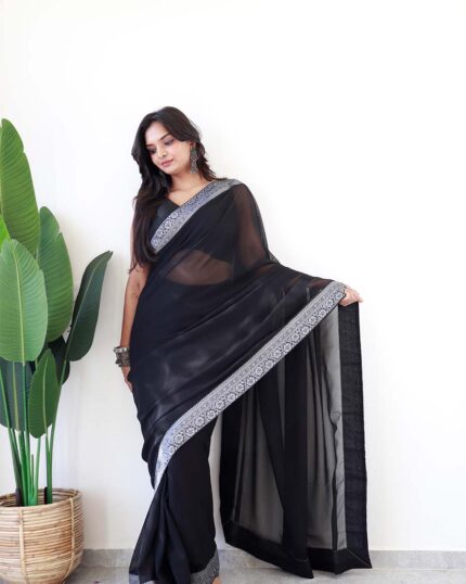 Black Colour 1-Minute Ready To Wear Georgette Saree With Blouse Piece
