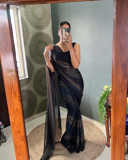 Black Colour 1-Minute Ready To Wear Chinon Saree With Blouse Piece